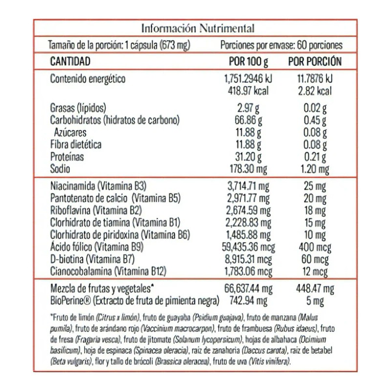 Este suplemento combina el espectro completo de las Vitaminas del Complejo B con el poder nutritivo de una variedad de frutas y verduras.