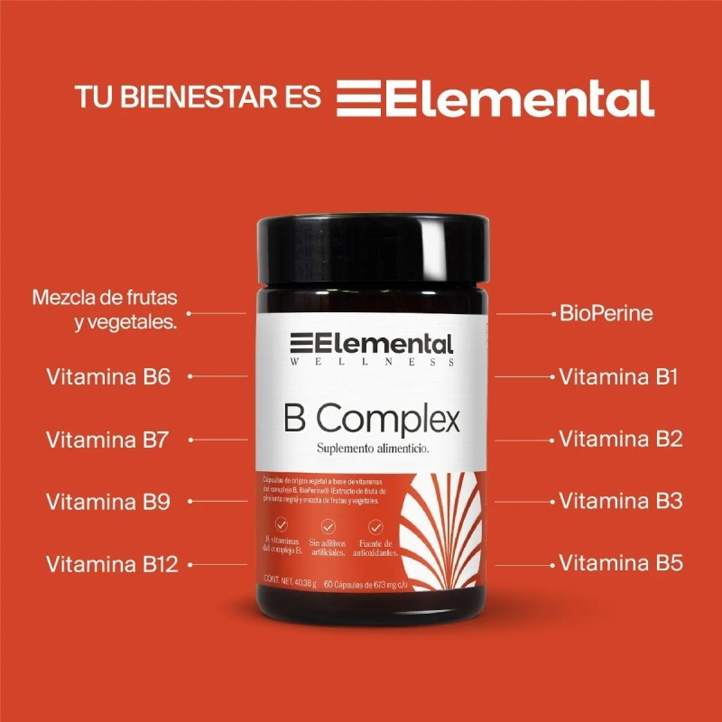 Complejo B | B Complex | Elemental | 8 vitaminas del complejo B | 13 frutas y vegetales | vitamina B1, B2, B3, B5, B6, biotina, ácido fólico, B12| Bioperine |60 porciones