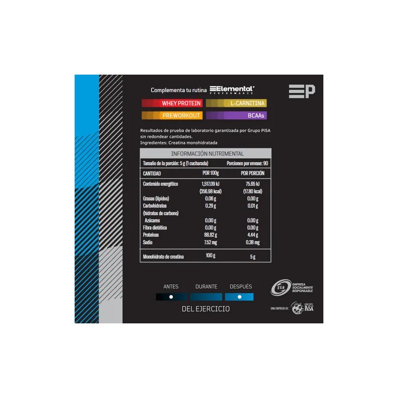 Elemental Performance ofrece una creatina de alta pureza, que se disuelve con facilidad y se absorbe rápidamente, sin causar molestias digestivas ✅💊🌊.