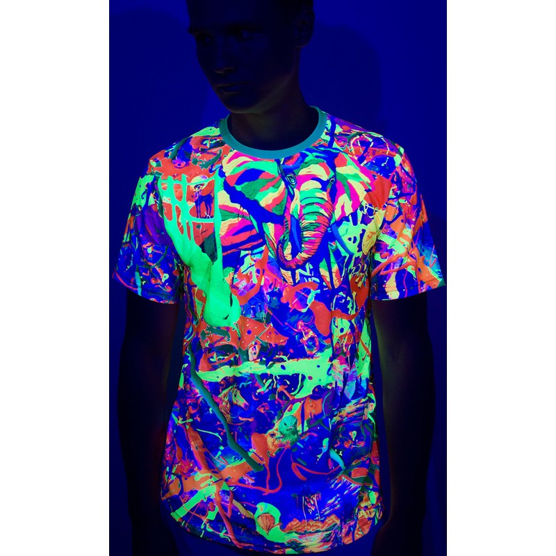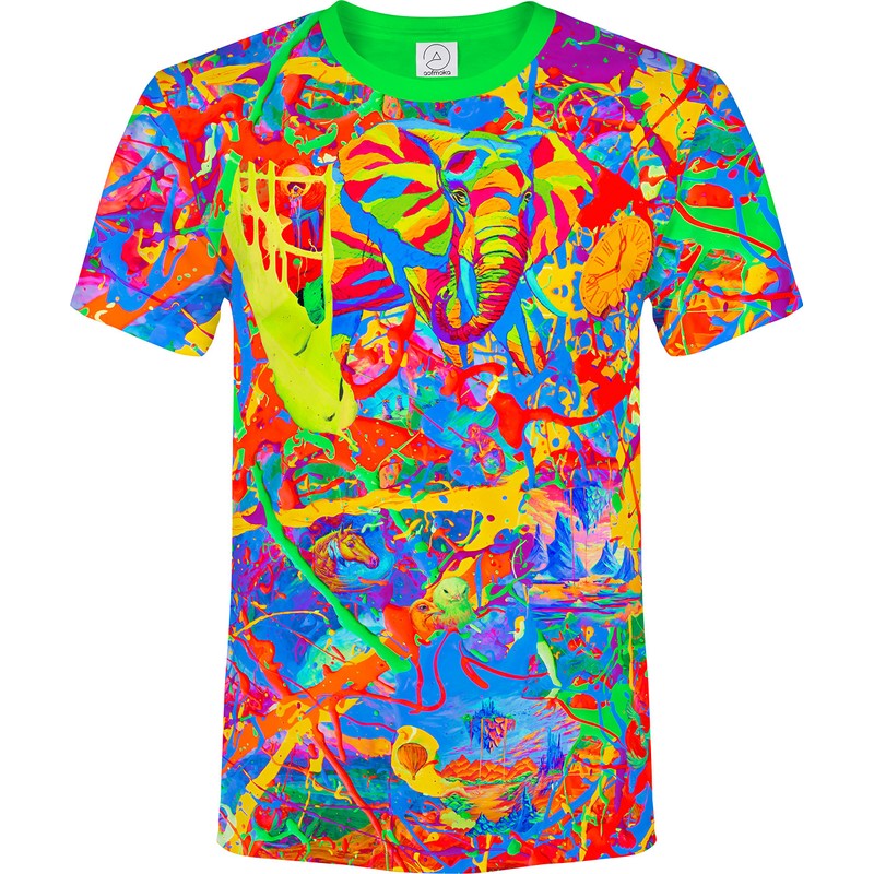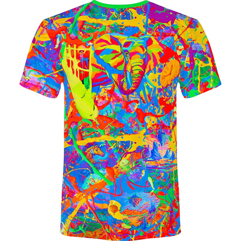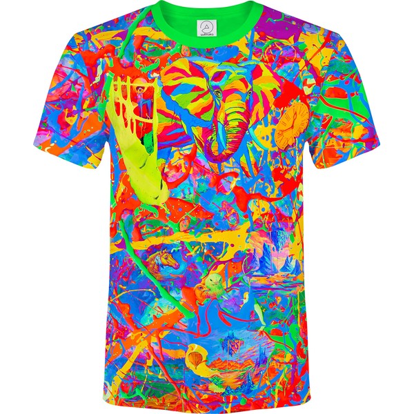Elephant Pegion Splash Paint Island Tree Horse TIme Watch Fantasy Blacklight UV Neon Fluorescent T-Shirt, Size Large