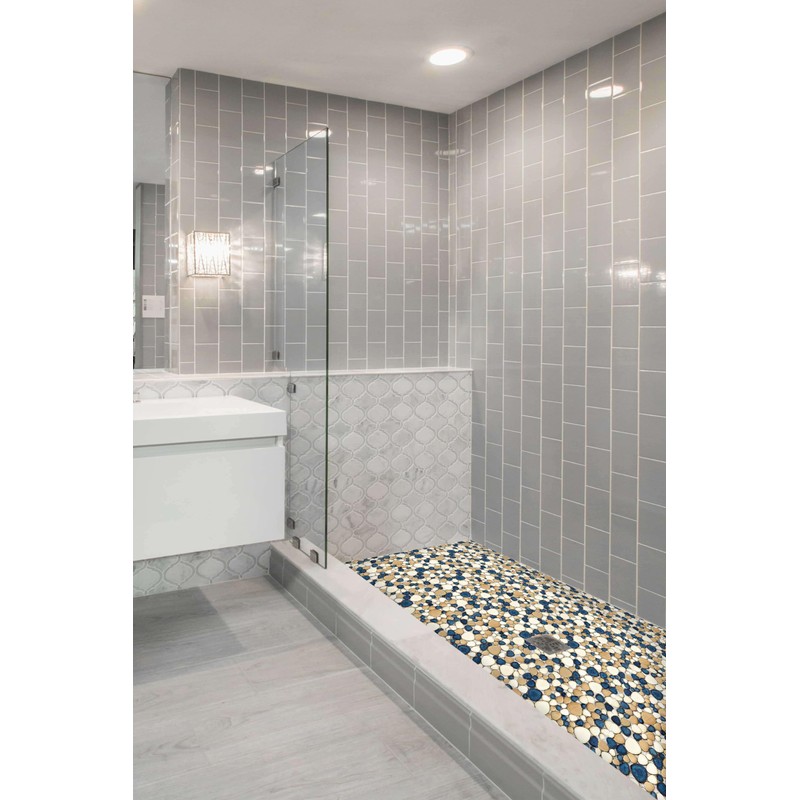 - Pattern & Color: This pebble tile mosaic closely emulate the look of natural pebbles, offering a rustic and textured aesthetic.The porcelain pebble mosaic has an irregular shape that adds a distinctive touch to your home. This pebble stone tile is beautifully made from porcelain and has a glazed blue finish that blends well with most decors. Glazed, smooth finish with a high sheen and random variation in tone. It has a shade variation and glossy glazed surface finish, providing options to match