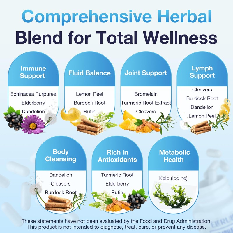 • Immune-Boosting Ingredients:This advanced formula features powerful components like cleavers extract, bromelain, lemon peel Powder, turmeric root extract, and kelp Extract , carefully selected formula not only promotes lymphatic health but also strengthens your immune system for comprehensive wellness.