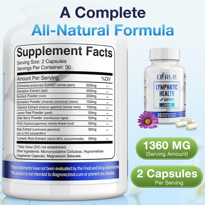 ELERULE Lymphatic Support Supplement, Lymphatic Drainage Supplements with with Dandelion, Burdock, Echinacea, Lemon & More, Lymph System Support for Men and Women – 60 Capsules