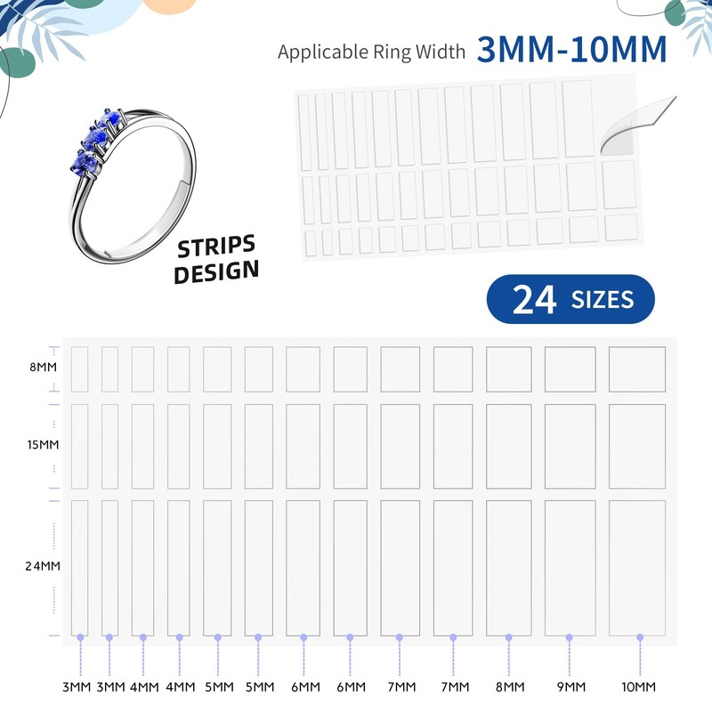 - Available in 234 Pcs 8 SizesEach sheet has 8 different sizes of ring size adjusters ranged from 3 to 10 mm,6 sheets of ring size adjusters in different sizes you will get,234 pcs in total, Large quantity and various sizes for you to choose and replace.3 different width is 8mm,15mm,24mm, each sheet is measured about 110 x 55 mm. we provide multiple sizes (3mm, 4mm, 5mm, 6mm, 7mm, 8mm,9mm,10mm) which can meet most of your needs for your rings and make your ring fit without having to re-size.