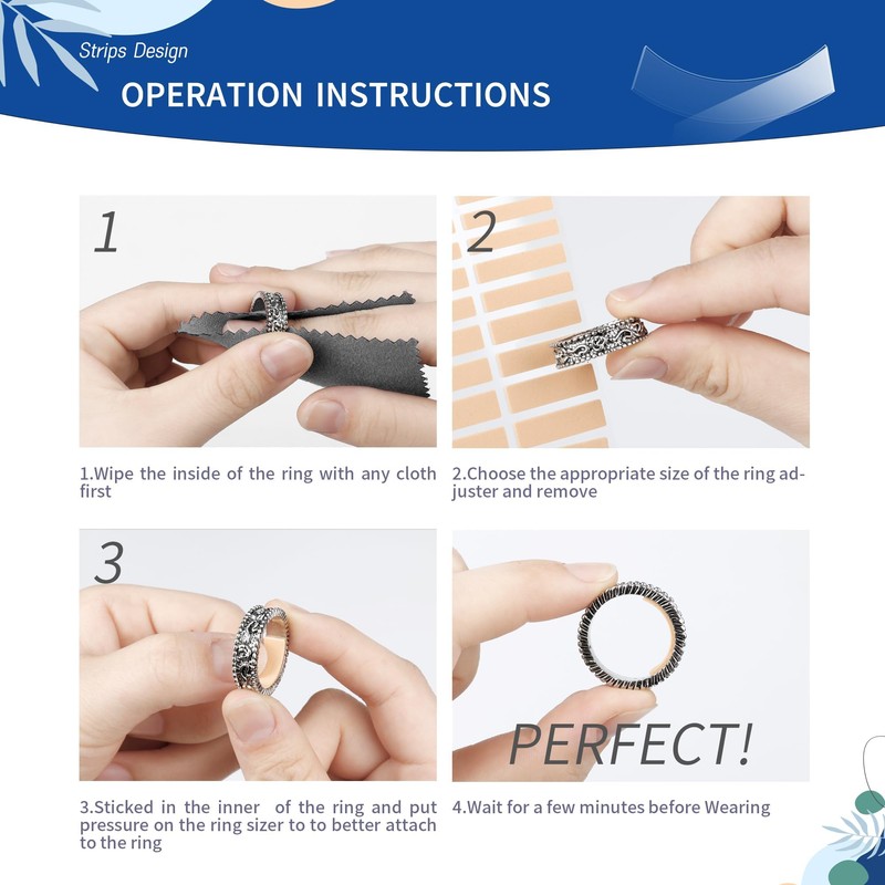 - Easy to useJust choose the appropriate size of the ring adjuster and stick it in the inner ring band, Press it lightly with your finger to better attach to the ring.aslo you could use the longer sticker on your ring to fix it if not tighten enough,perfect for ring band of more than 3 mm in width,convenient to use and ideal gifts for your friends or family.