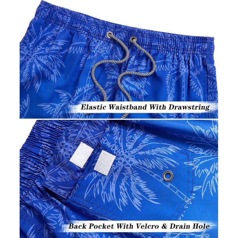 - Mesh Liner and Pockets -- The beach shorts with mesh liner have 2 slanted hand pockets and 1 back pocket with velcro and drain hole, effective storage wallet, key or other small items.