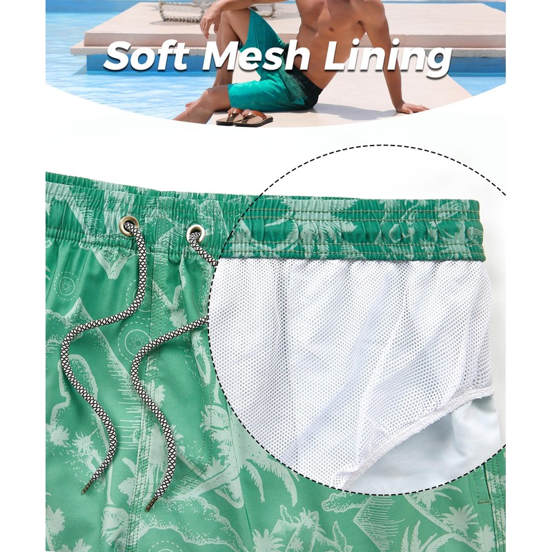 - Mesh Liner and Pockets -- The beach shorts with mesh liner have 2 slanted hand pockets and 1 back pocket with velcro and drain hole, effective storage wallet, key or other small items.