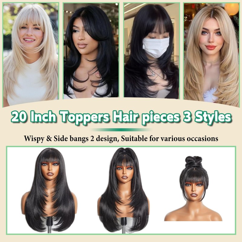 - Multifunction Hair Topper: Hair toppers for women is the perfect solution to transform your hair styles, it will add the hair volumme, cover gray hair, modify hairline, frame face etc. Bring a beautiful and charming look to you in several minutes