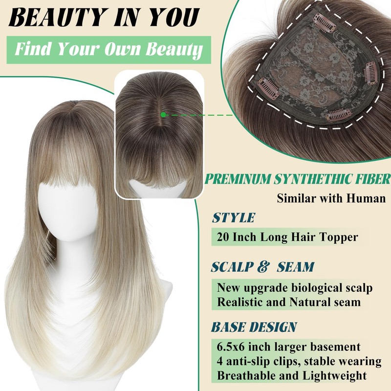 ELEVAVE Hair Toppers for Women with Thinning Hair, 20 Inch Toppers Hairpieces for Women with Wispy Clip in Bangs 360° 3D Realistic Scalp Daily Use (Ombre Dark Root to Blonde)