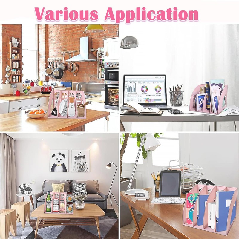 Elezeal A4 File Holder Magazine File Folder Desk Organizer, Compartments Bookshelf Document Divider Paper Box Bookends for Office Home Organization and Storage Racks (Pink, 4 Compartments)
