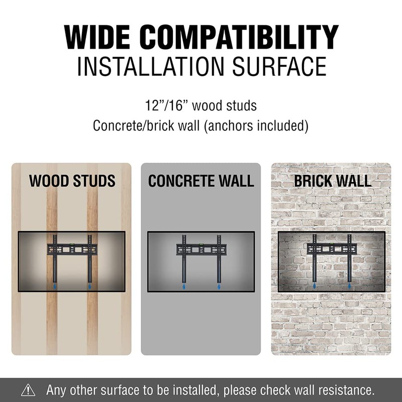 - CERTIFIED FOR COMPLETE SAFETY, BUILT TO LAST! This product is made of solid carbon steel and works perfectly for safety mounting on 12", 16” wood studs, concrete, and brick walls. Preferably do not install it on the drywall alone, unless there is a reinforced structure inside, especially for TV mounts.