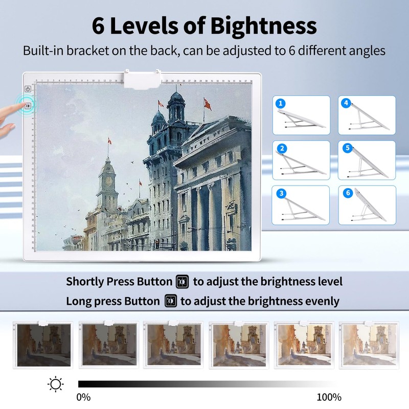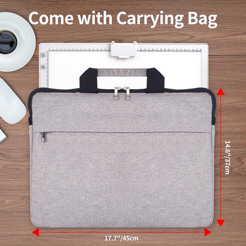 - 【 Carry Bag, Built-in Stand and Top Magnetic Clip 】 The carrying bag is padded and lined with soft anti-scratch fabric, which helps to keep the screen protected and make it more durable. The built-in stand is hidden on the back of the A3 light pad, foldable and 6 levels adjustable. The built-in stand and the magnetic clip on light pad can hold paper and diamond painting canvas easily, you can unfold the stand when you are doing diamond painting or vinyl weeding to your most comfortable posture.