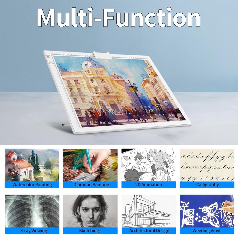 - 【 Wide Application 】 This A3 tracing drawing pad has a working area 15.2" * 11.9", overall dimension including black frame is L 16.7’’ x W 13.5’’ x H 0.47’’,which is large enough for diamond painting, weeding vinyl, stencilling, 2D Animation, calligraphy, embrossing, scrapbooking, tattoo transferring, sketching, sewing projects, stainde glass, quilting and so on. And it also a good gift choice for Christmas, Birthday and Holidays for your friends, kids and your family.