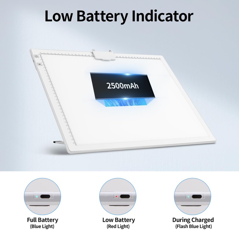 - 【 Battery Powered and USB Powered with USB-C Port 】 Our LED lightpad comes with a 2500mAh internal battery which allows you to use it any where without any power source, which makes your project more convenient as well as more enjoyable! Works for around 5-6 hours after charged 2 hours at a time. This A3 light table uses a USB-C interface to easily access any USB port, such as a USB wall charger, computer, or mobile power bank. Also,the USB-C interface is more stable than the Micro interface.