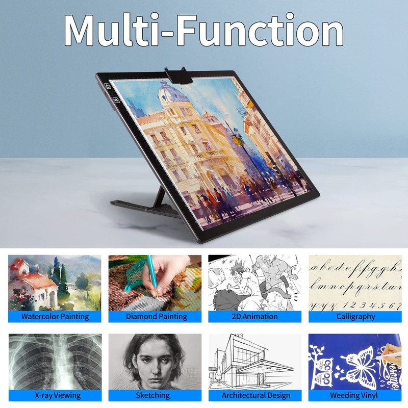 - 【 Carry Bag, Built-in Stand and Top Magnetic Clip 】 The carrying bag is padded and lined with soft anti-scratch fabric, which helps to keep the screen protected and make it more durable. The built-in stand is hidden on the back of the A3 light pad, foldable and 6 levels adjustable. The built-in stand and the magnetic clip on light pad can hold paper and diamond painting canvas easily, you can unfold the stand when you are doing diamond painting or vinyl weeding to your most comfortable posture.