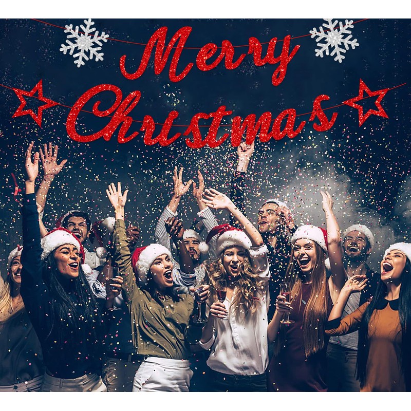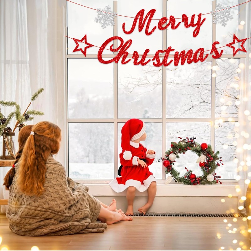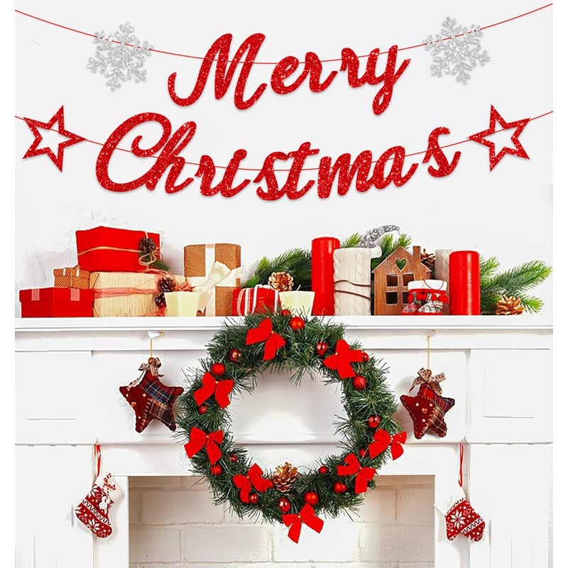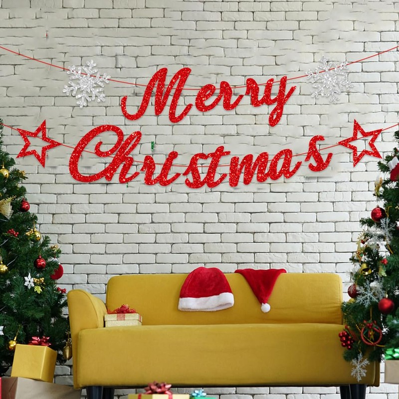 Elicola Red Glitter Merry Christmas Banner Christmas Banner with Snowflakes Stars Flag for Garland Christmas Decorations Festival Celebration Indoors Outdoors Hanging String Flag