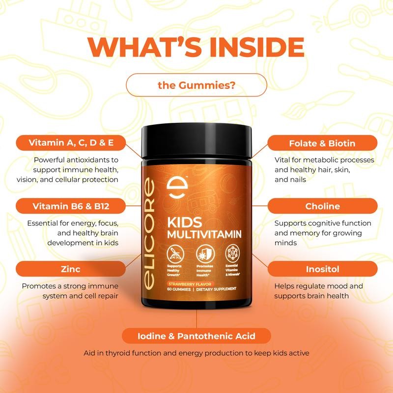 ELICORE Kids Multivitamin Gummies | Immune, Growth, Focus & Attention Support | Vitamins A, C, D, E, B6, B12, Zinc | Gluten-Free, Non-GMO | 60 Ct