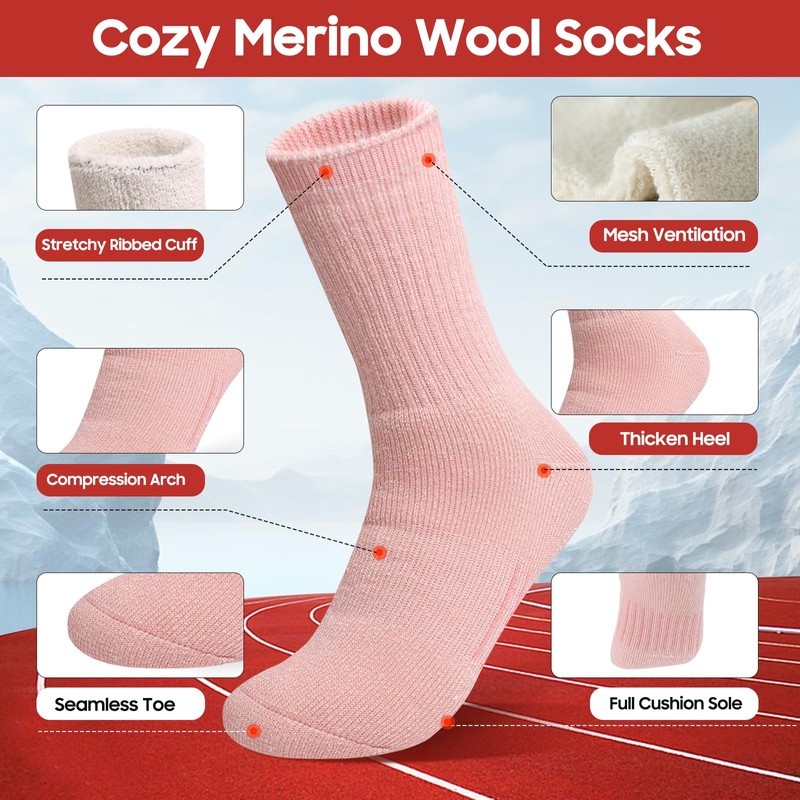 - Comfort and Support: These socks have soft cushioning to stop blisters on your heels and toes. They improve the fit between your shoe and foot, keeping you warm from your feet to your legs. With supportive strips at the calf and arch, they fit snugly, help blood flow, reduce tiredness, and aid muscle recovery. The elastic band at the top keeps them in place
