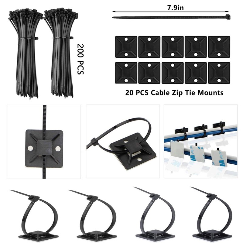 - Cable Management Organizer:4x cord protector 20in L x 0.4in w, 25 x Cable Zip Ties,35Cable Clips,11Cord Holders,200 Cable Fastening Ties:6inx 0.12in,20 Cable Zip Tie Mounts 3.54L x 1.1 inW, 5 Self Adhesive Cable Tie Rolls: each roll is 39 in