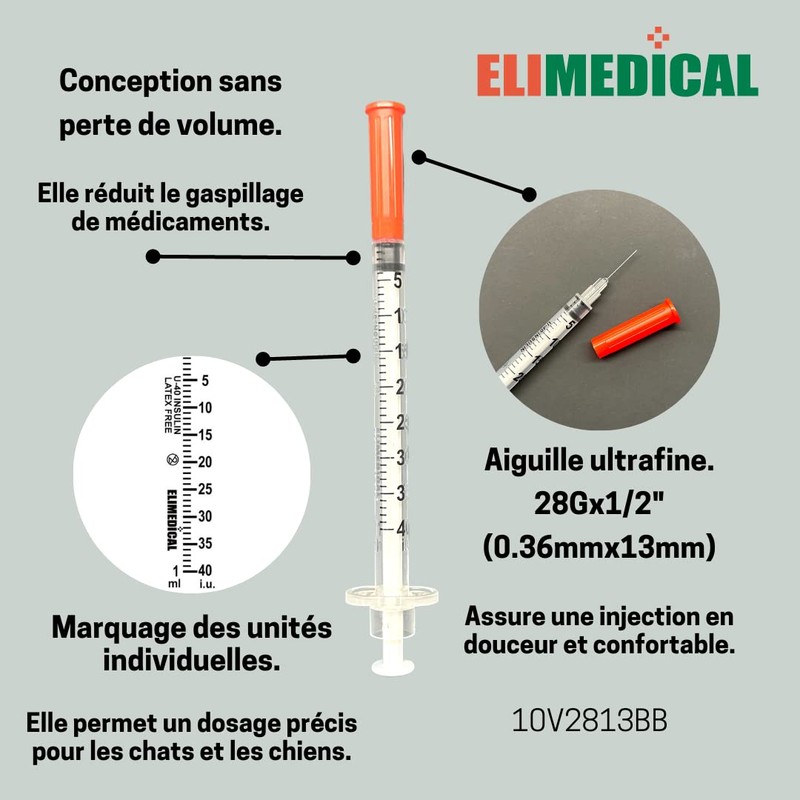 Elimedical Veterinary Syringe U-40 1ml 28G x 1/2" Individually packed, 100pcs/box 10V2813BB