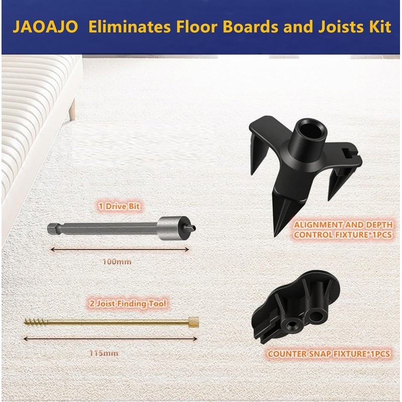 - JAOAJO Loose Floor repair kit includes - 5 AIDS: Joist finder screws *2;Tripod calibration and depth control fixture for floor repair *1;Double-hole fixture *1, bearing *2; Detailed instructions *1 to guide the specific use process.