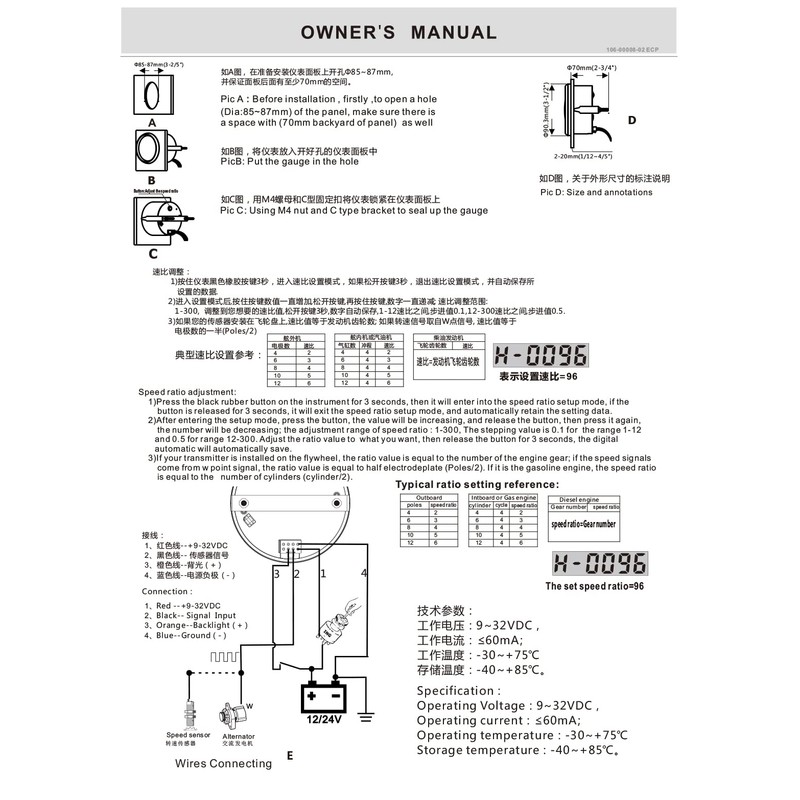-Be suitable for all kinds of tacho RPM sensors, and display the rotation speed of the engine.