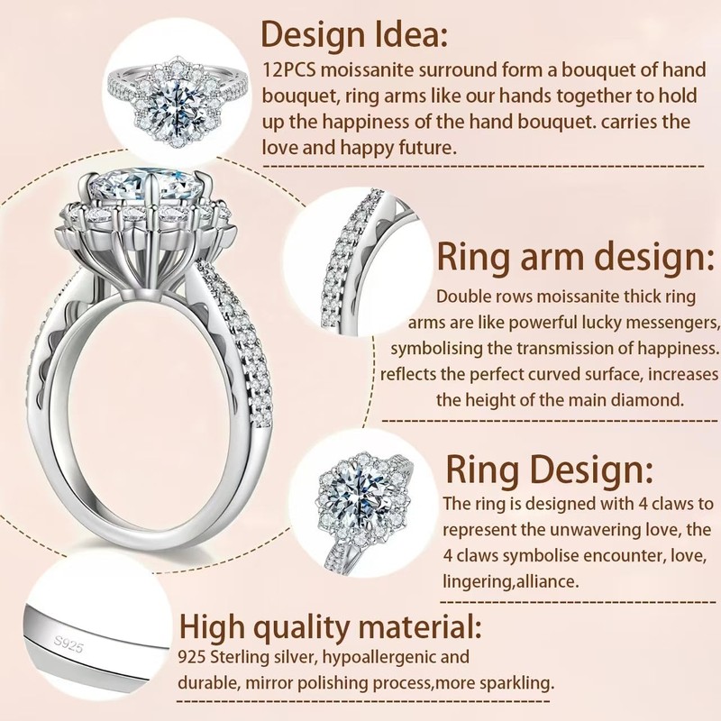 - 【2 CT Big Flower Shaped Moissanite Engagement Ring】 Our Elio Passero moissanite engagement ring for women crafted with a 2 CT big Moissanite gemstone in the center and 12 pieces diamonds around,they combined like a beautiful flower,shining like stars around the moon.The arm is decorated with a lot of small moissanite, showing more exquisite design than real diamond,giving people a very luxurious feeling.