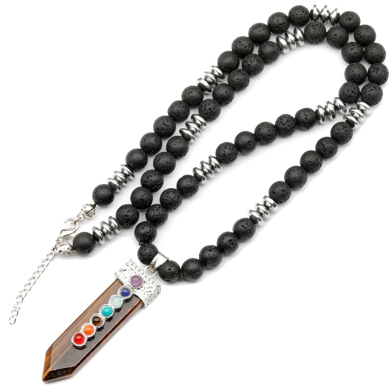 ElisaJewelryArt - Natural Tiger Eye Chakra Pendant Black Lava Stone Beaded Necklace Genuine Gemstone Anxiety Stone Clasp Closure Necklace Unisex Necklace (22, Tiger Eye)
