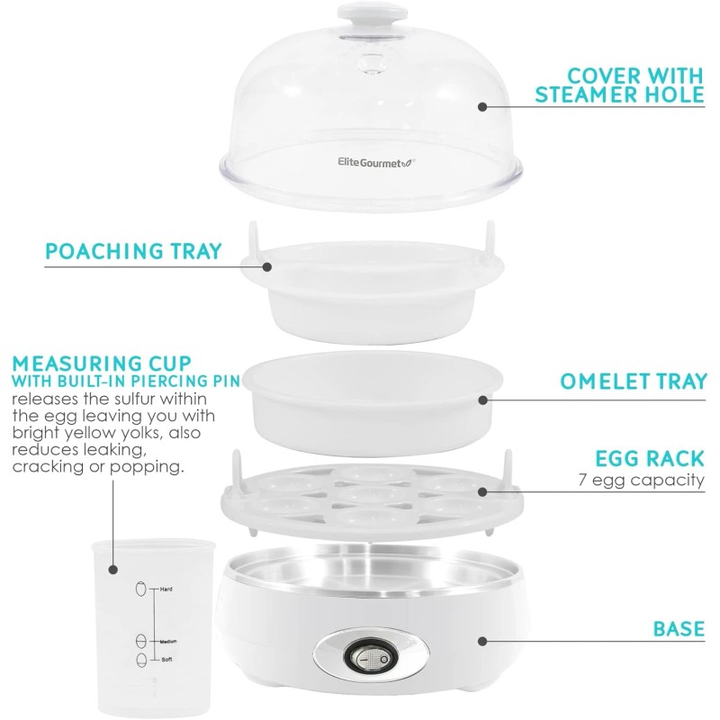 • VERSATILITY: Whether pairing with avocado toast or preparing deviled eggs for a potluck, the Elite Gourmet Easy Egg Cooker is an all-in-one egg boiler, poacher, scrambler, omelet/veggie steamer, and more!