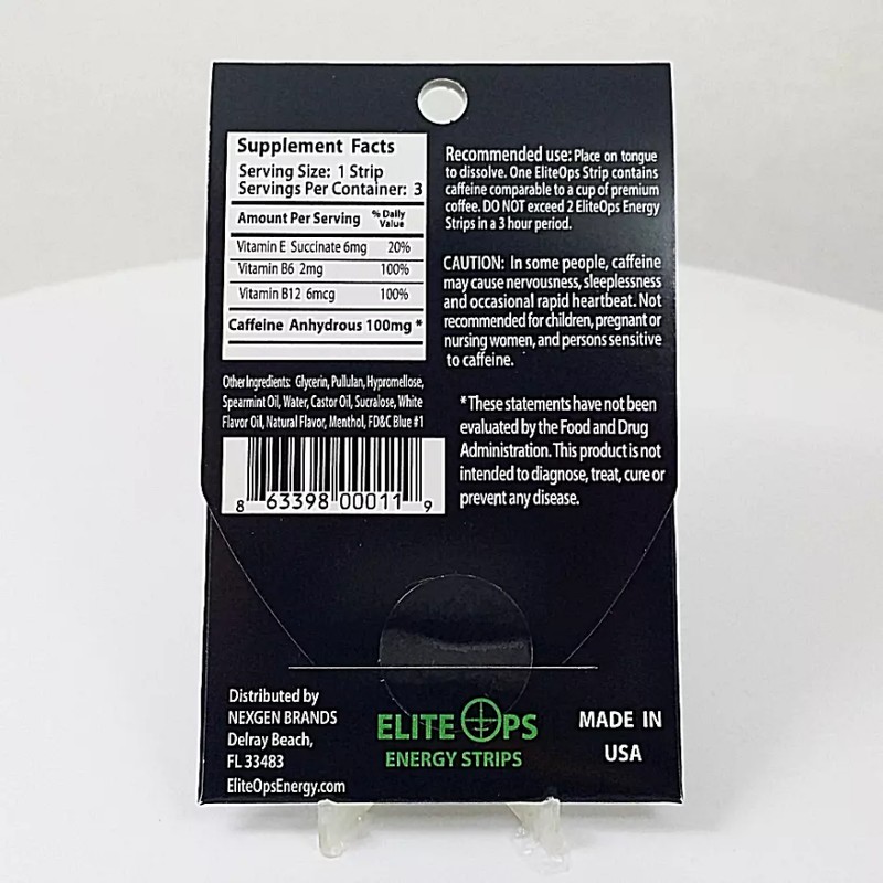 Elite Ops Energy Strips are an innovative alternative to coffee, energy drinks, and other energy products that deliver on the promise of convenience, portability and effectiveness. Elite Ops Energy Strips dissolve on your tongue and deliver a 100/mg dose of caffeine, along with vitamins B6, B12 & E. Elite Ops Energy Strips give you energy for hours without any crash. Elite Ops Energy Strips are sugar-free, fat-free, gluten-free and have zero calories.