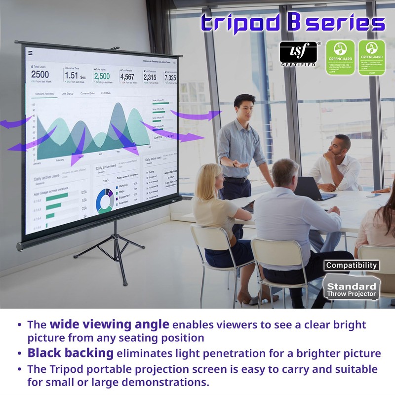 • Lightweight and portable tri-pod style projection screen features telescopic support that allows for a variety of height/aspect ratio settings.