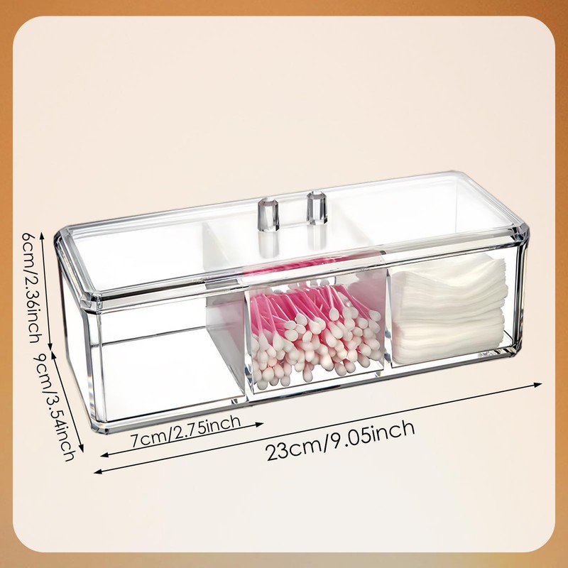 Elitecran Split Storage Box with Lid, Acrylic Bedroom Dressing Table Organiser, Cotton Buds Container, 3 Compartments Cotton Pad Dispenser for Dresser, Washbasin, Bathroom, Kitchen