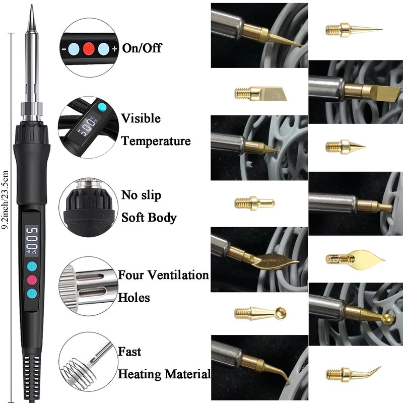 - 👍【Efficient Soldering Iron】 Power: 110V 60W, Temperature: Adjustable from 180℃/356°F to 500℃/932°F. Featuring a digital screen and a 47-inch/1.2m long wire, this soldering iron is designed for fast heating. Ideal for smoothing, modifying, and trimming your 3D print models post-printing.