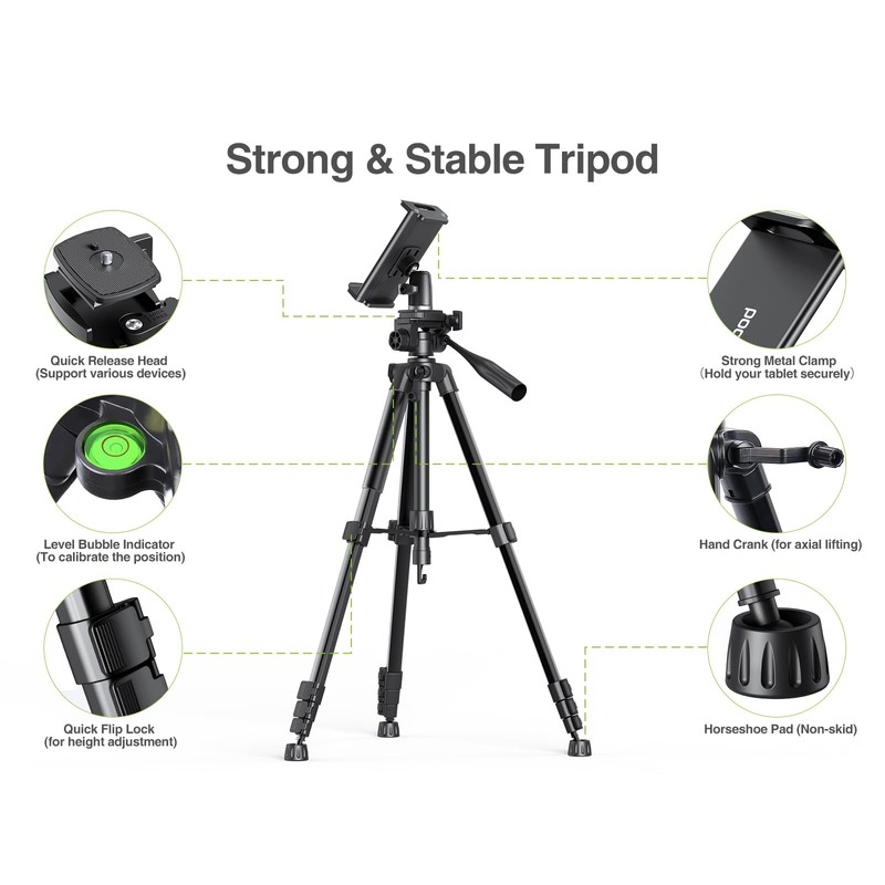 68in Tall iPad Tripod & Multi-height Level--This iPad tripod stand is adjustable from 18 to 68 inches, about 10 inches higher than other tripods on the market. Each of 3 legs has 5 extendable sections, enabling it to be configured to rest on any type of surfaces without the fear of tipping over, and the height of the pan-head can be adjusted. It not only meets the needs of different people at multiple height level, but also provides a higher shooting perspective than other tripods for iPad.