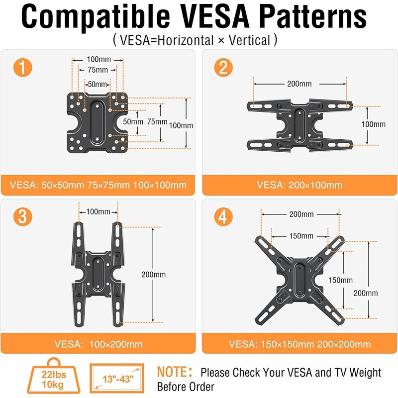 - Universial RV TV Mount: This RV mount fits most 13-43 Inch LED, LCD, OLED Plasma, Flat Screen TVs, with VESA patterns range from 50x50mm to 200x200mm and holds up to 22 lbs/10 kg. Perfect for RV, camper, trailer, motorhome, campervan or road tractor. Mounting wooden board 1/2 inch thick. Please check VESA size, TV weight, wooden board and possible blocked cable input location before purchase