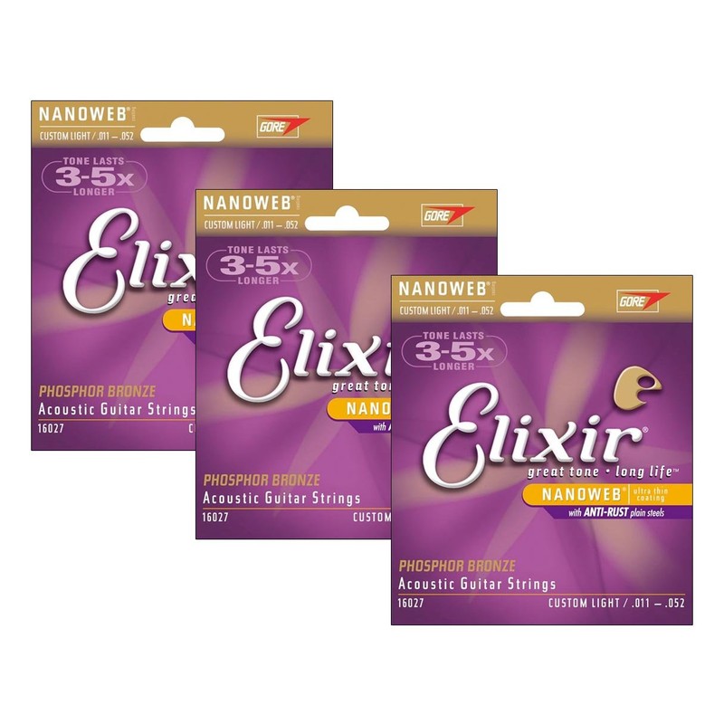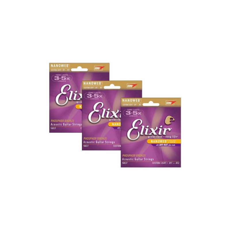 Elixir 16027 Nanoweb Custom Light Phosphor Bronze Acoustic Strings 11-52 (3-pack)
