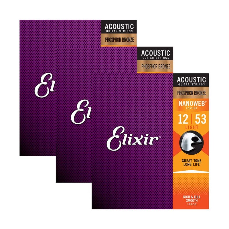Elixir 16052 Acoustic Phosphor Bronze Nano Light 12-53 (3 Pack Bundle)