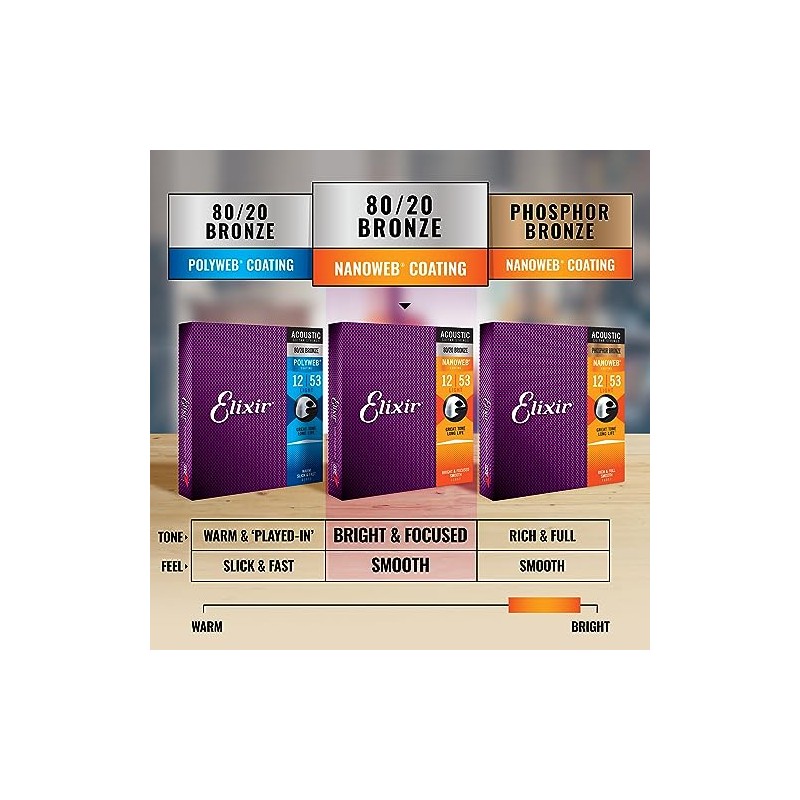 Prolong your tone with the same acoustic guitar strings that experienced players worldwide trust to keep their incredible tone longer than any Other string available. Unlike Other string brands, Elixir strings coats the whole string. This protects not only the outer string surface but also the gaps between the windings where common tone-deadening gunk typically builds up in Other Brands' coated and uncoated guitar strings. Anti-rust Plating on plain steel strings ensures longer tone life for the entire set. Who wouldn't love more quality playing time between the hassle and cost of string changes? Premium by design, these acoustic strings constructed with 80/20 (80% copper, 20% zinc) bronze wrap wire boast a crisp, bright tone with an expressive, vibrant presence. Compared to our original POLYWEB Coating, The ultra-thin NANOWEB Coating allows a more traditionally textured, uncoated feel. For a slicker, gentler feel, try the original POLYWEB Coating on our 80/20 Bronze acoustic strings, which also feature a more robust and rounded tone. For more of a balance between bold and bright, our phosphor bronze acoustic guitar strings with NANOWEB Coating deliver full-bodied tone and sparkling high-end clarity alongside the same traditional feel as these 80/20 Bronze strings. Of course, the kind of string you play is all a matter of personal preference. Not sure what tone or feel is right for you? Try them out for yourself, and find your new favorite string from Elixir strings. For a more in-depth look at what makes our strings so special, scroll to the branded info further down the page. Elixir strings: great tone. Long life.