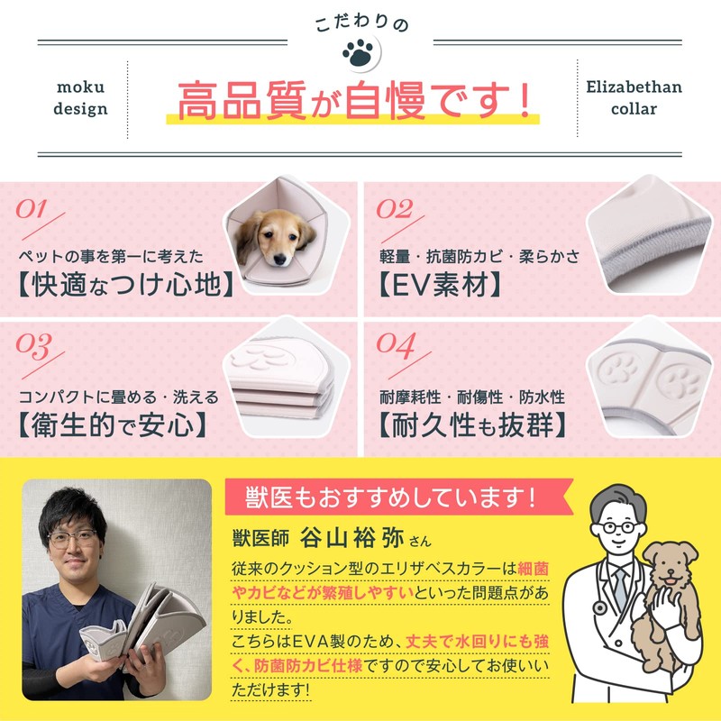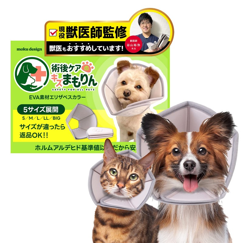 - (Safe and High Quality with Strict Inspection) Made with your precious pet in mind. This is a safe, high-quality Elizabeth color that has passed strict inspection and is made according to environmental hormones such as formaldehyde. Even if you put it in your mouth, it is no problem. It is also carefully crafted to last a long time. The interior has nibs that are placed along the neck for better blood circulation. In addition, the EVA is soft and resilient, so it is impact resistant and does not hurt even when bumped. After surgery or treatment, it is recommended that you do not remove your Elizabeth collar from your hospital. When drinking water or eating rice, please try the dish stand up to about 3.9 inches (10 cm) high. The moku design Elizabeth collar is so light that it is stress-free. It can be folded compactly, making it convenient for going out or going to the hospital