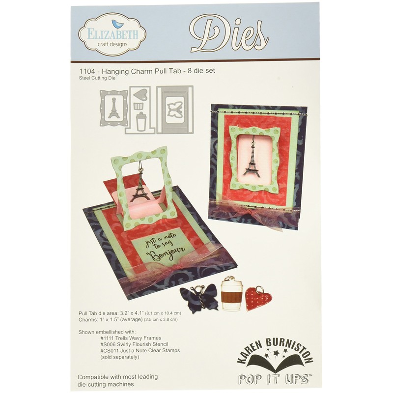 Elizabeth craft designs-pop it up metal dies by Karen burniston. Elizabeth craft dies will give an added touch to any paper project and are compatible with most die-cutting machines. This 9x6 inch package contains eight metal dies. Design: hanging charm pull tab. Made in USA.