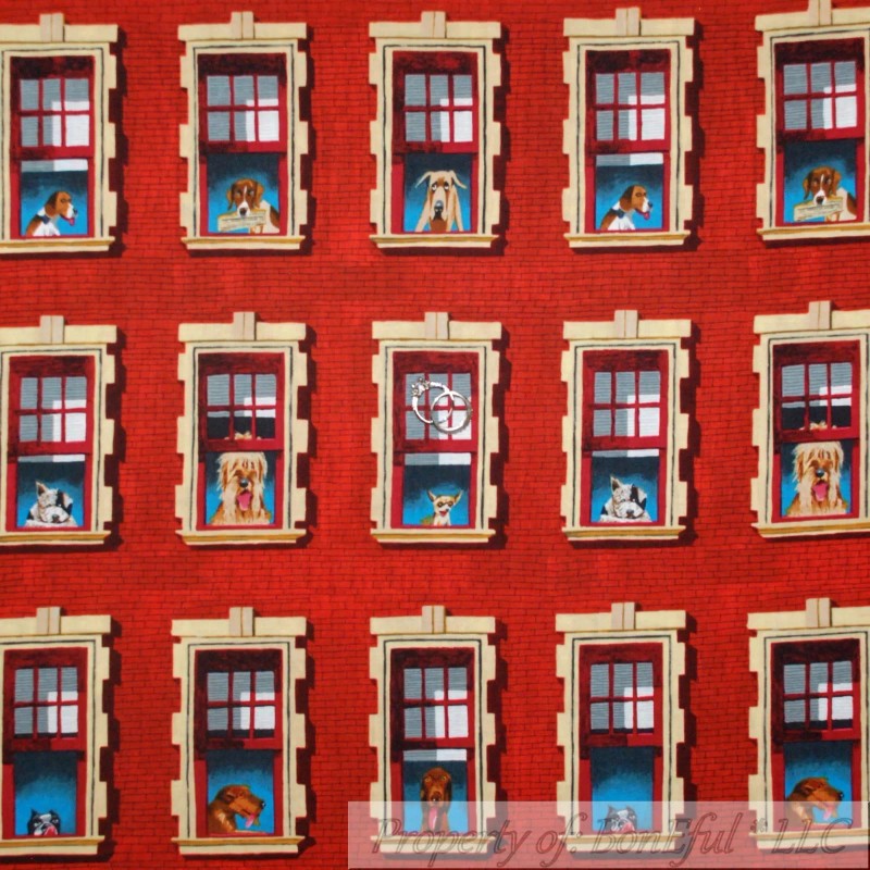 Elizabeth's Studio BonEful Fabric FQ Cotton Quilt Red Brick City House Window Puppy Hound Dog Breed