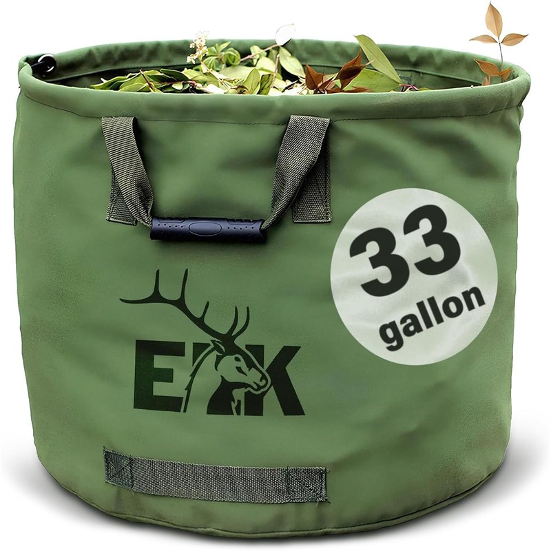 The ELK multipurpose garden leaf waste bag will help you clean your yard and garden with ease and speed. The 22" width by 18" height military grade canvas bag fits and holds open standard 33 gallon waste bags. Use it to clean your yard, harvest fruits and vegetables, organize items for trips and provide storage of home goods. It's extra tough carrying straps with heavy duty military grade canvas allow for this bag to withstand the most demanding conditions. Rubber handles make this bag comfortable when carrying while the PVC elastic bone is used to keep the bag structurally round and upright. It's the must-have product for your yard.