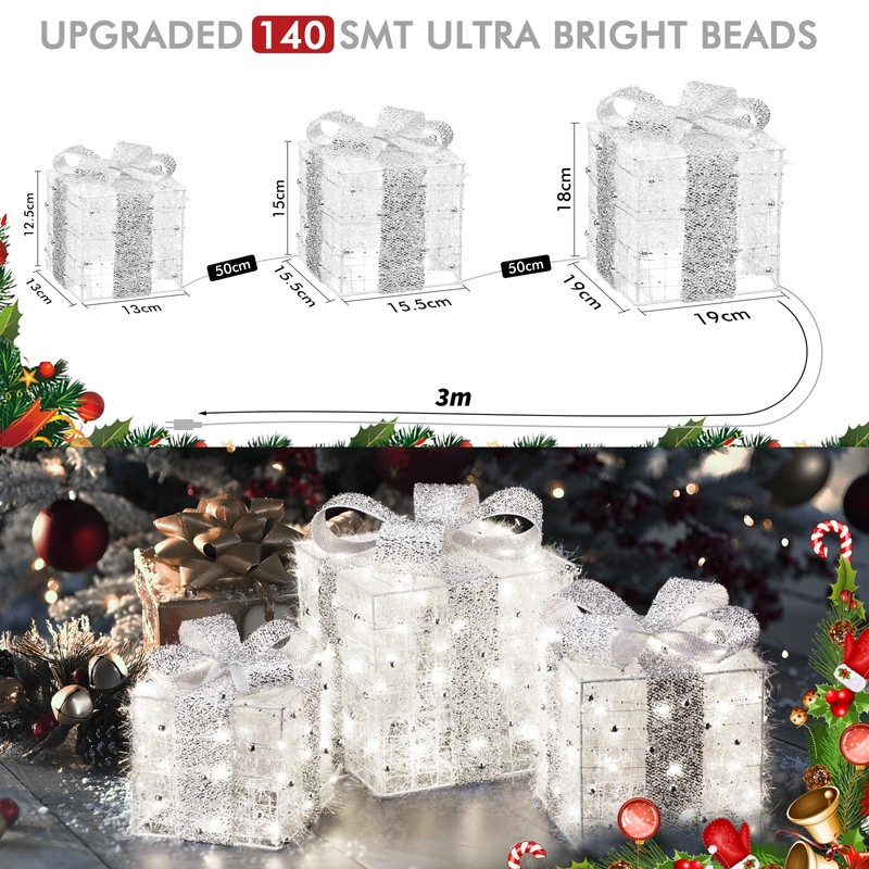 • Unique Christmas decoration: If you are tired of the usual Christmas lights, why not choose a special Christmas decoration. Decorate your room and Christmas with new LED gift box. Three different large, medium and small gift box sets. Silver beads and filigree stick to the iron material. A total of 140 LEDs are installed. The Christmas tree with gift box is like Santa's gift and gives you a fairytale atmosphere.