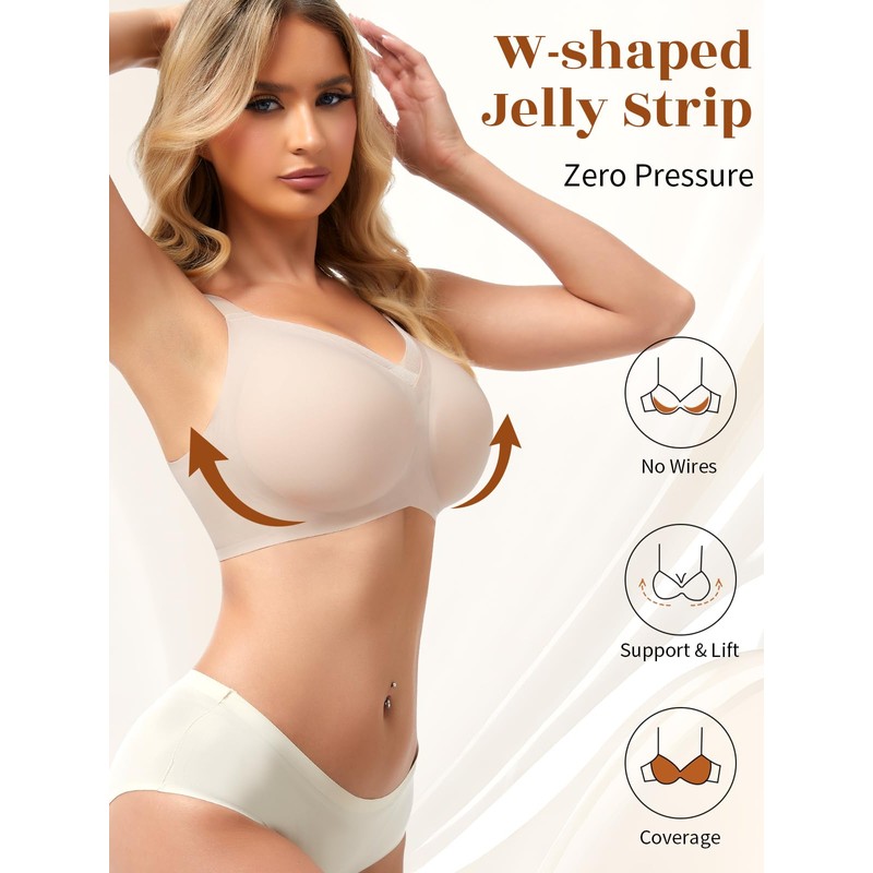 - Support Without Wires – Our wireless bras feature a unique W-shaped jelly strip and supportive molded cups that shape and lift your bust naturally. No underwire means no pinching or poking—just buttery-soft comfort you can enjoy all day.