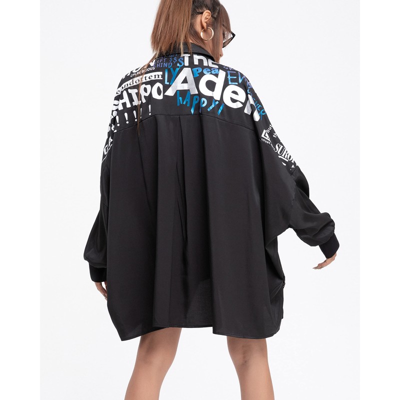 ellazhu Women's Loose Fit Oversized Button-Up Top with Batwing Sleeves High-Low Hem Printed with Newspaper Design GY2749 Black