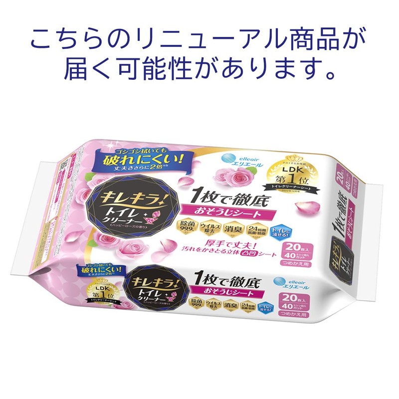 Elleair Kirekira! Toilet Cleaner, Refill, 20 Sheets (10 Sheets x 2 Packs), Happy Rose, 9.1 x 13.0 inches (230 x 330 mm), Clean Thoroughly with 1 Sheet