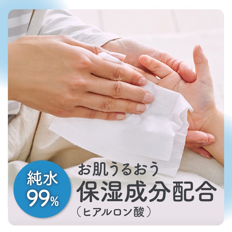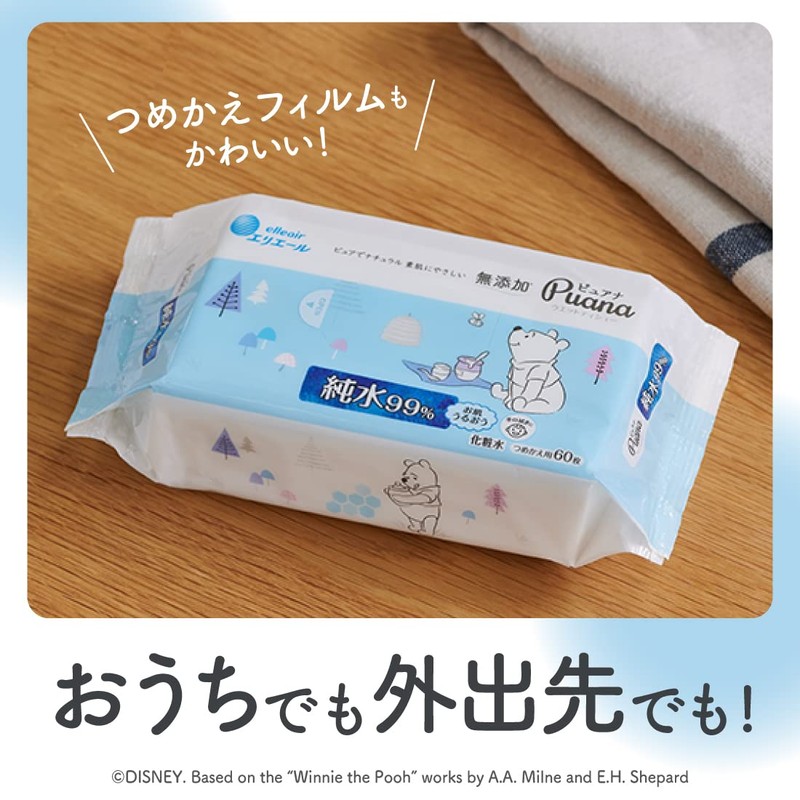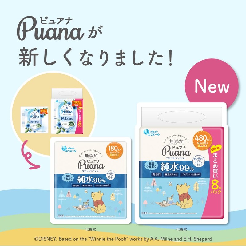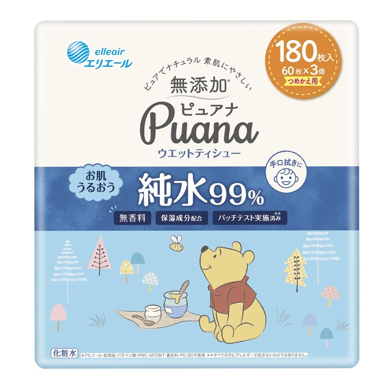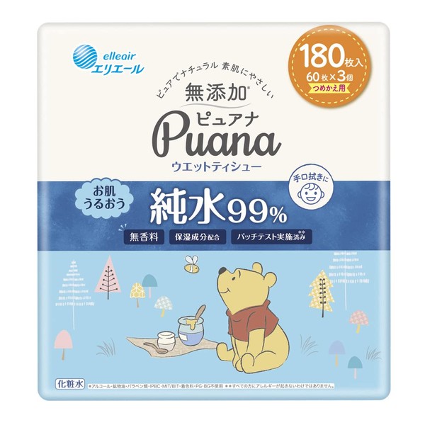 Elleair Puana Wet Tissue 99% Pure Water Refill, 180 Sheets (60 Sheets x 3 Packs)