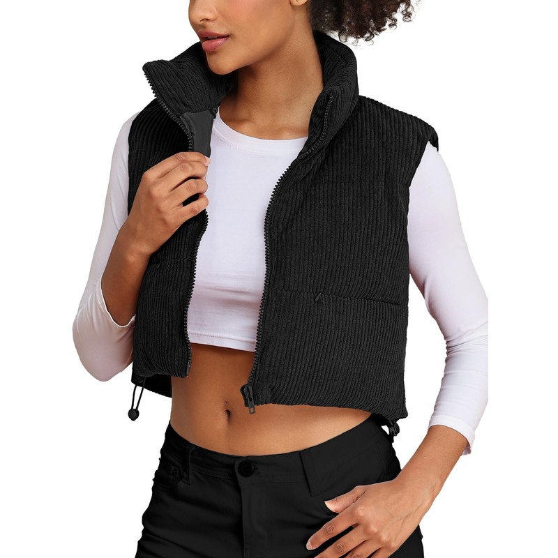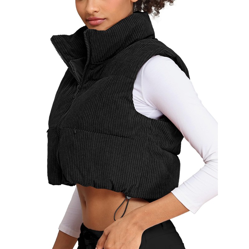 ELLEVEN Corduroy Cropped Puffer Vest for Women High Stand Collar Puffer Vest Women Warm Lightweight Vests Outerwear whit Pockets Black Medium