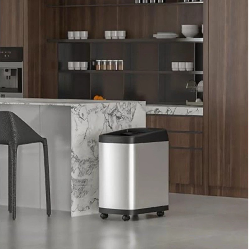 【Sleek Roll-Top Lid Design】 :The roll-top lid design not only keeps the trash hidden but also prevents unpleasant odors from escaping. The smooth opening and closing mechanism effortlessly seals in the odor, keeping your kitchen smelling fresh.