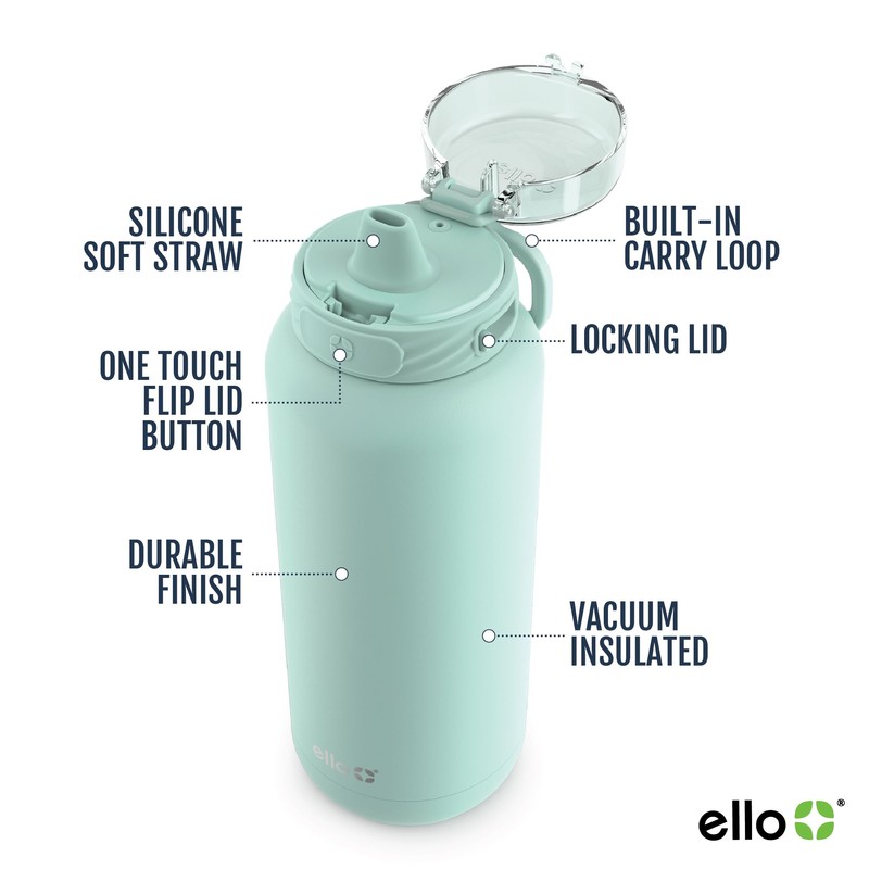 Ello Cooper 40oz Stainless Steel Water Bottle with Straw and Carry Handle, Double Walled and Vacuum Insulated Metal, Leak Proof Locking Lid with Soft Silicone Spout, Reusable, BPA Free, Yucca